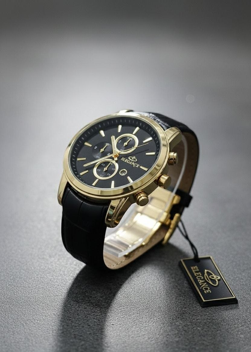 ☑️ELEGANCE 🔥excellent ⌚️ الگانس مناسب آقایان دارای روز شمار بالاترین گرید بازار موتور ژاپن قفل پروانه ای رنگ ثابت بندچرمی فیکس موتور کوارتز طرح کرنوگراف