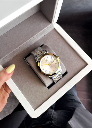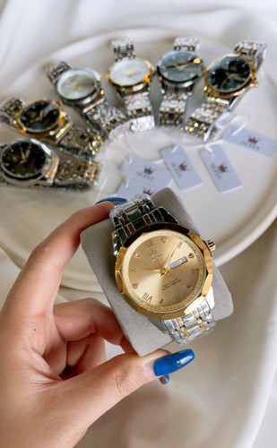 ست ساعت الوز موتور کوارتز مقاوم در برابر آب دارای روز شمار ایام هفته صفحه شب نما بند استیل الماس قفل دوپروانه شیشه الماسی