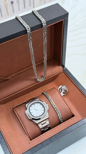 ست مردانه ساعت و بنگل و  گردنبند و حلقه بهمراه جعبه کادویی و باتری یدکی