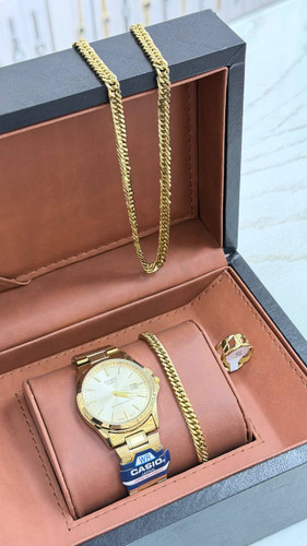 ست مردانه ساعت کاسیو مردانه تقویم فعال و بنگل و  گردنبند و حلقه بهمراه جعبه کادویی و باتری یدکی
