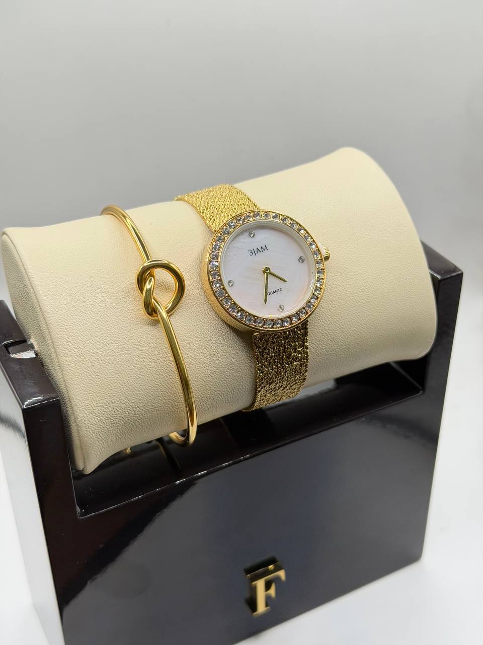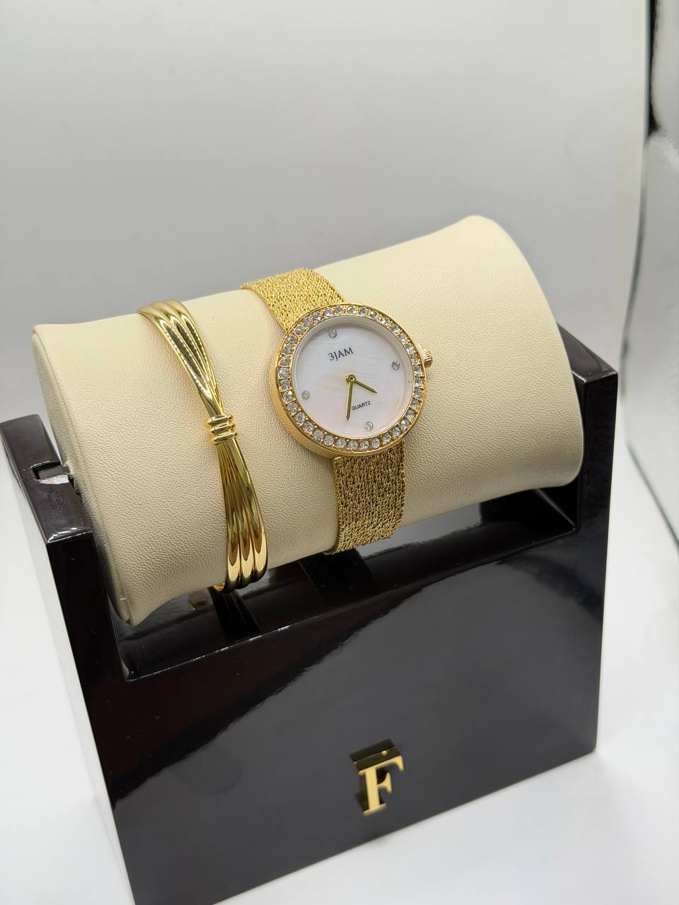 ساعت 3jam برند شرکتی و سفارش دوبی بند طرح طلا کوب و قفل ریل به همراه دستبند با کیفیت