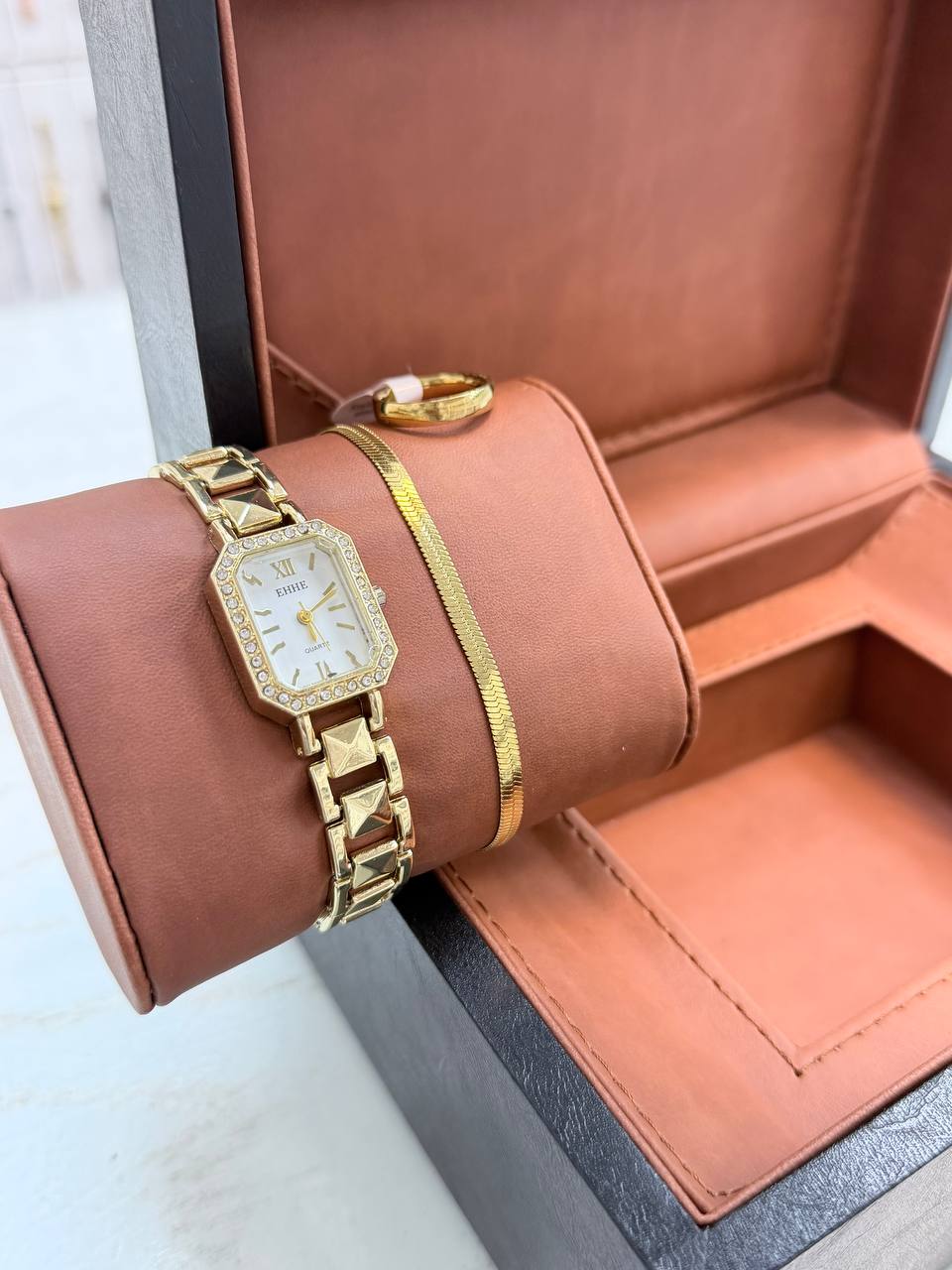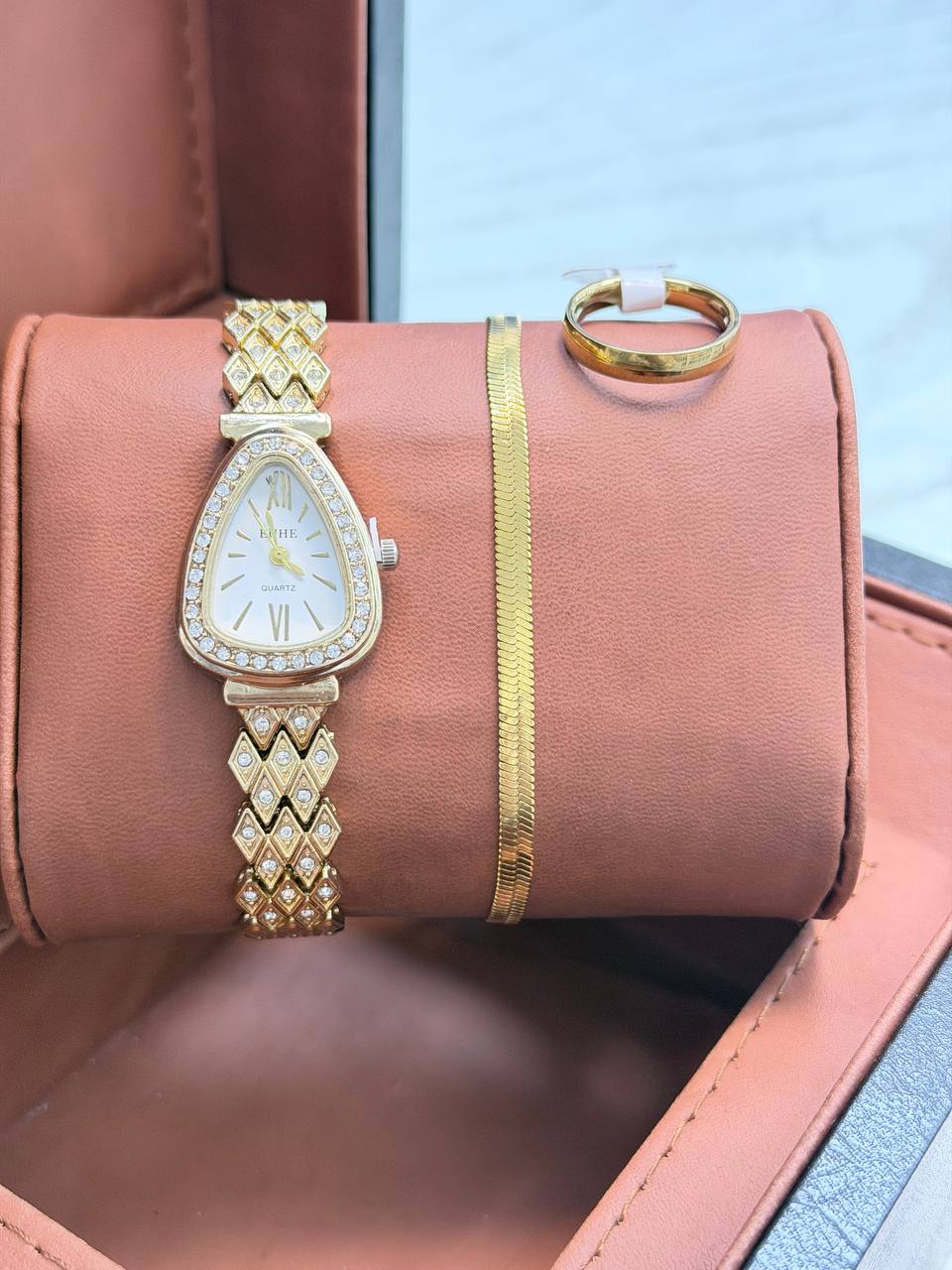 ست ساعت ودستبند و حلقه زنانه طلایی رنگ
