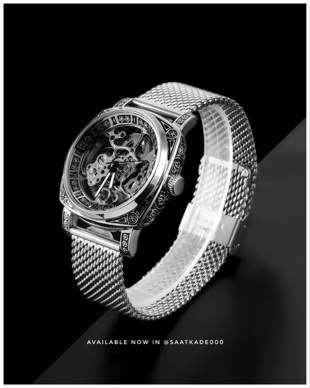 ساعت اتومات Mirage (بدون نیاز به باتری) موتور ژاپن درجهیک بند استیل حصیری قاب استیل حکاکی قفل گیرهای
