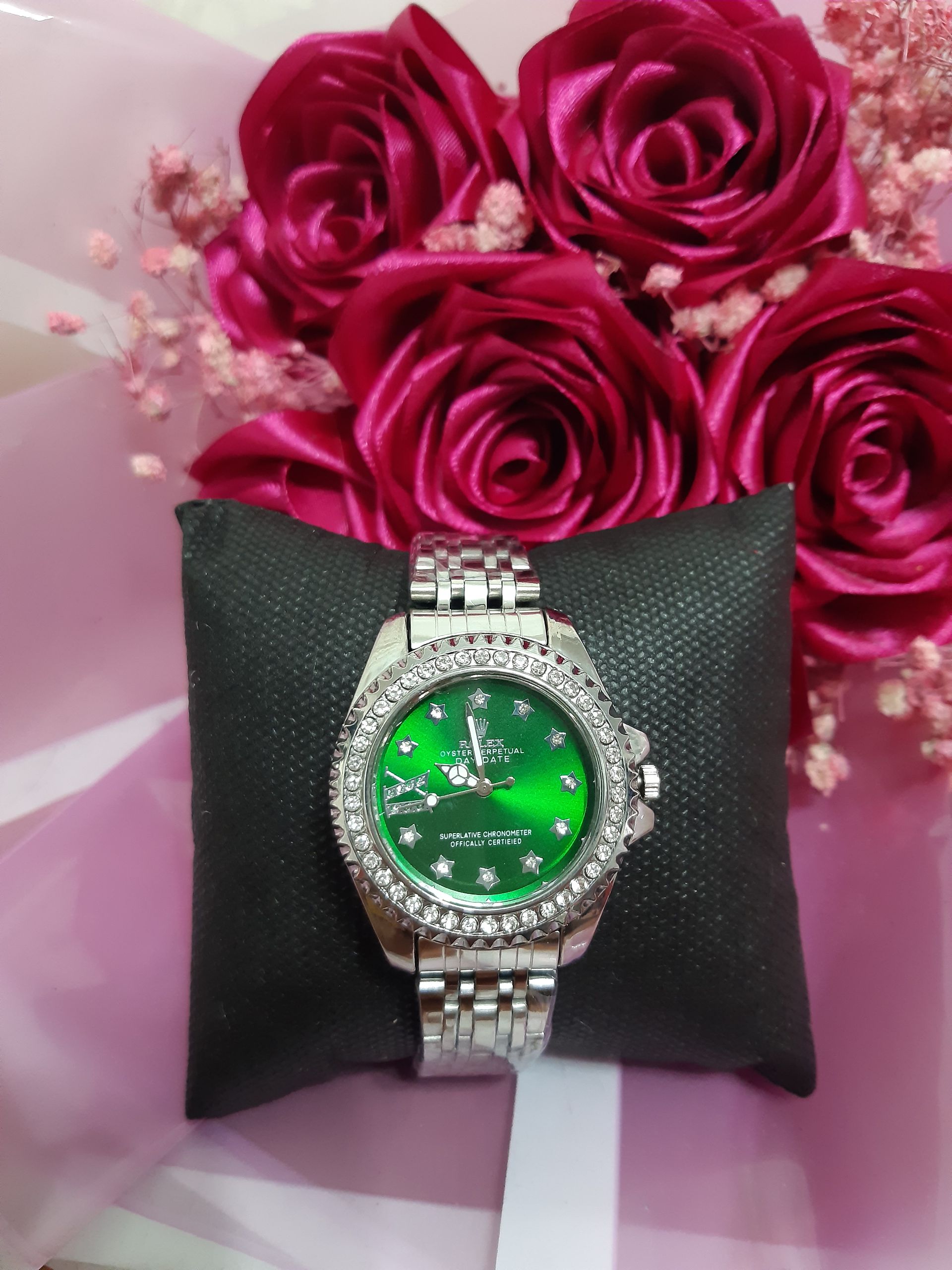 ساعت رولکس نگین دار دارای تقویم کیفیت عالی قفل پروانه ای جنس درجه یک