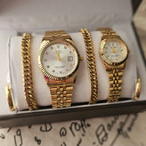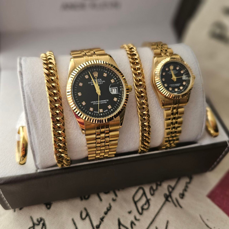 ست ساعت زنانه و مردانه رولکس و دو عدد دستبند کارتیر استیل طلایی و دو تا حلقه