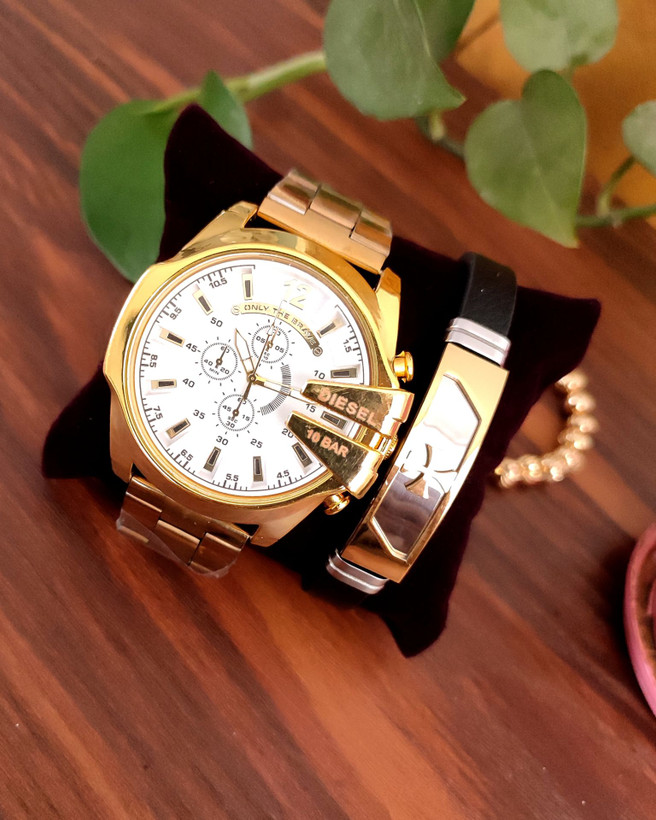 ست ساعت مردانه مارک دیزل شاخدار طرح کورنو به همراه دستبند چرمی پلاک استیل بهترین گزینه برای کادو و هدیه به همراه جعبه کادویی