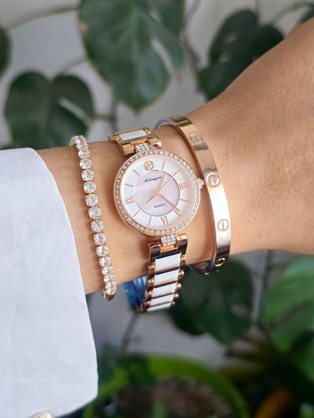 ساعت زنانه شرکتی اصلی بند سرامیکی به همراه النگو کارتیر و دستبند فول نگین