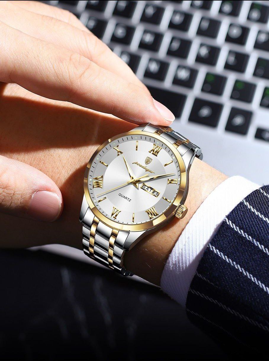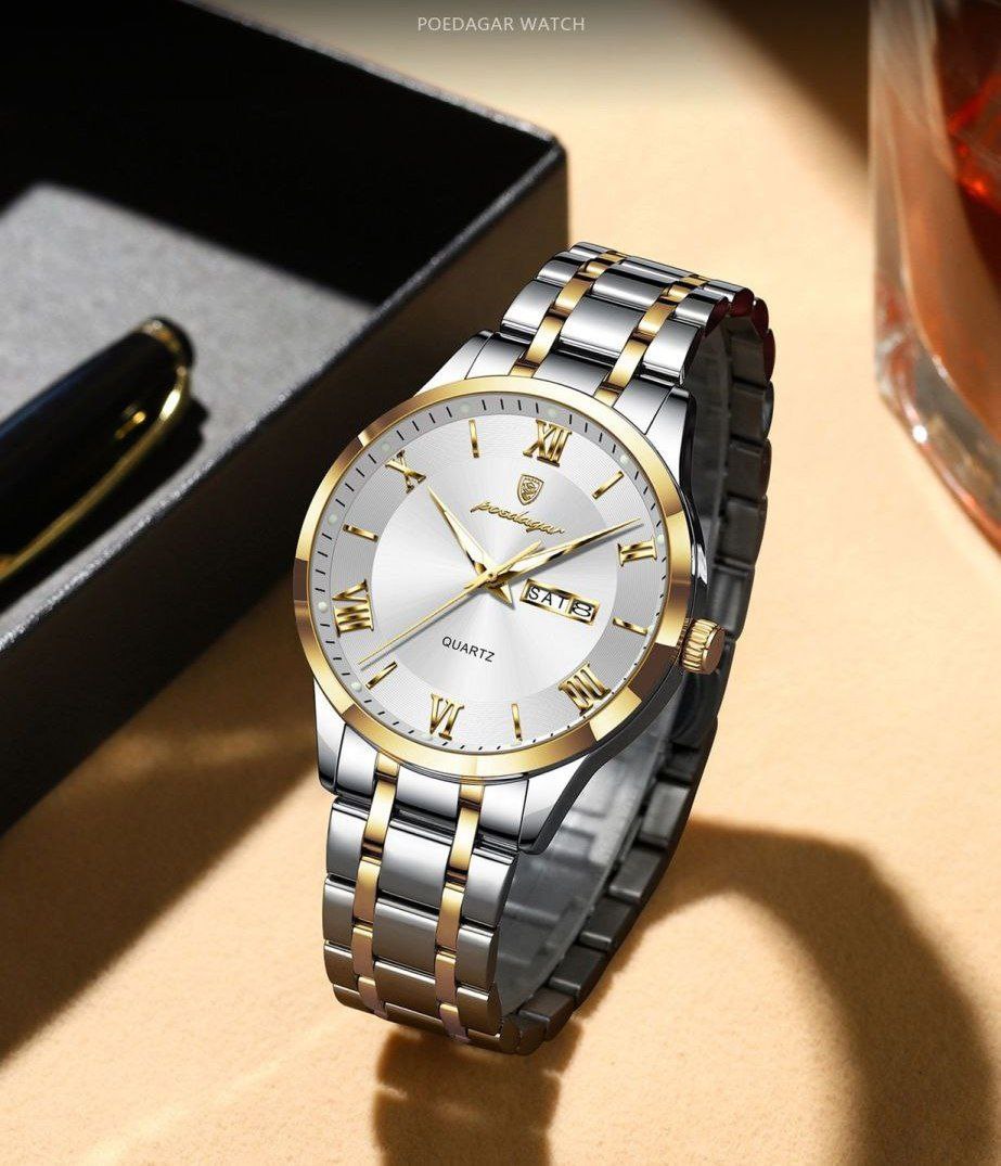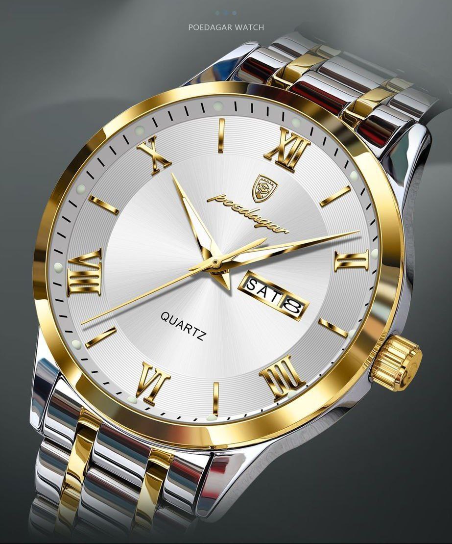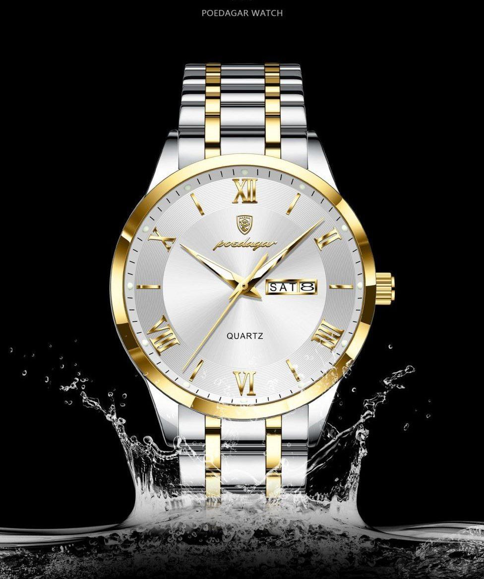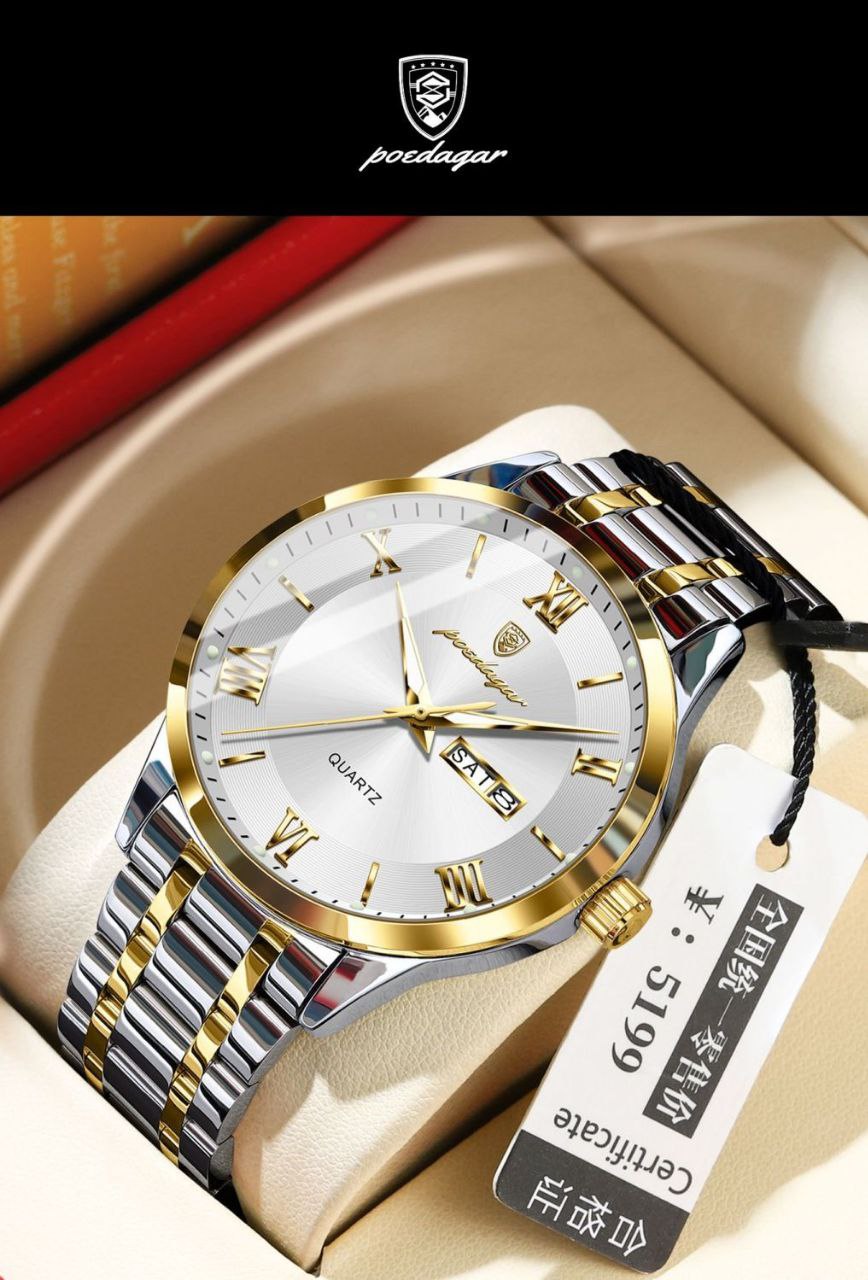 ساعت پوداگار الماسی مردانه دارای روز شمار ایام هفته صفحه شب نما برند شرکتی بند استیل قطر صفحه ۴۲ میل کریستال قاب یاقوت کبود ضدآب تا عمق بالا شیشه معدنی رنگ ثابت قفل سگک دوپروانه ای موتور کوارتز