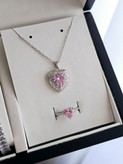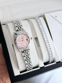 ست ساعت و دستبند و گردنبند و انگشتر(فری سایز) صورتی ساعت رولکس دارای روزشمار بهمراه جعبه کادویی و باتری یدکی