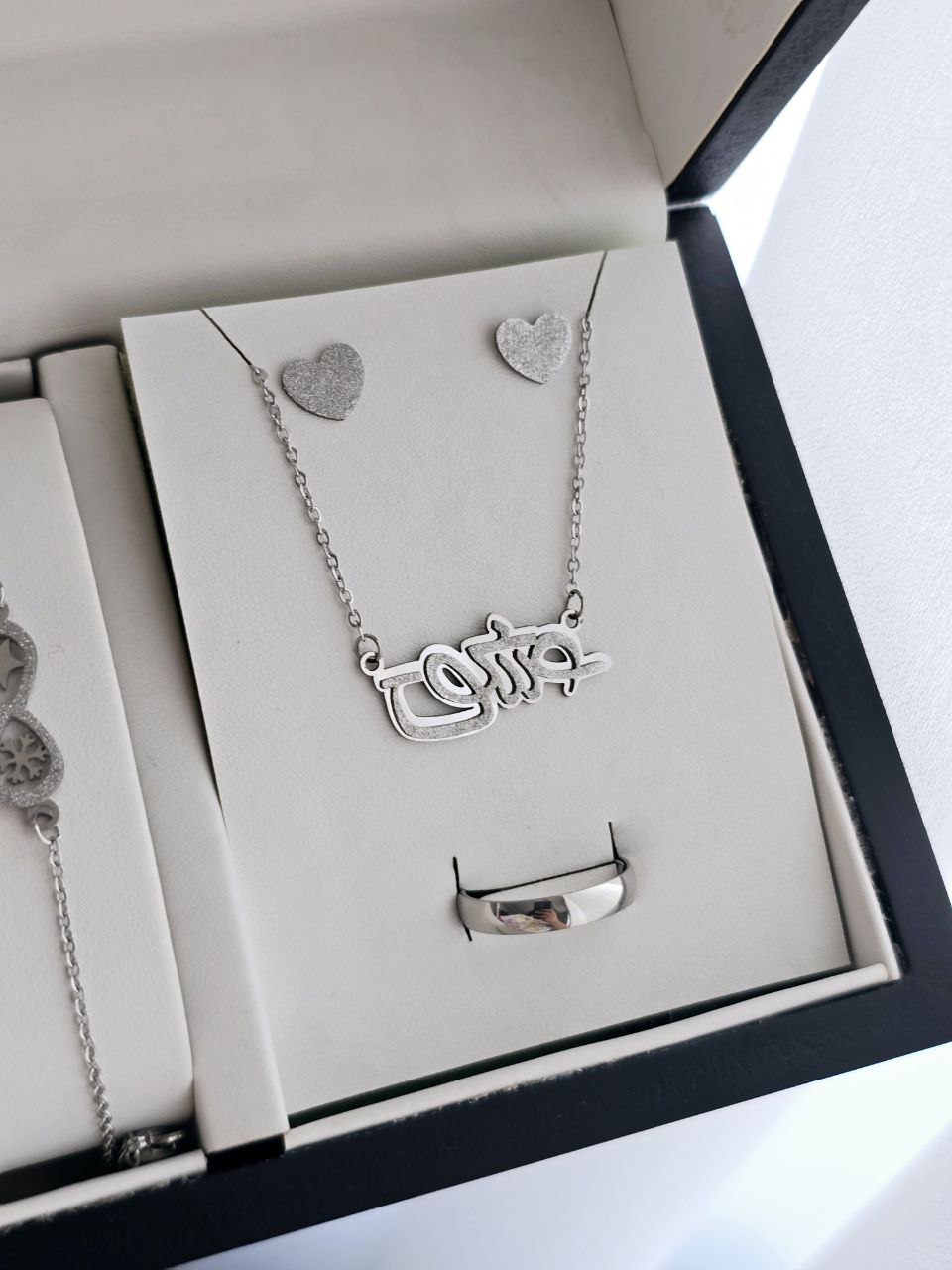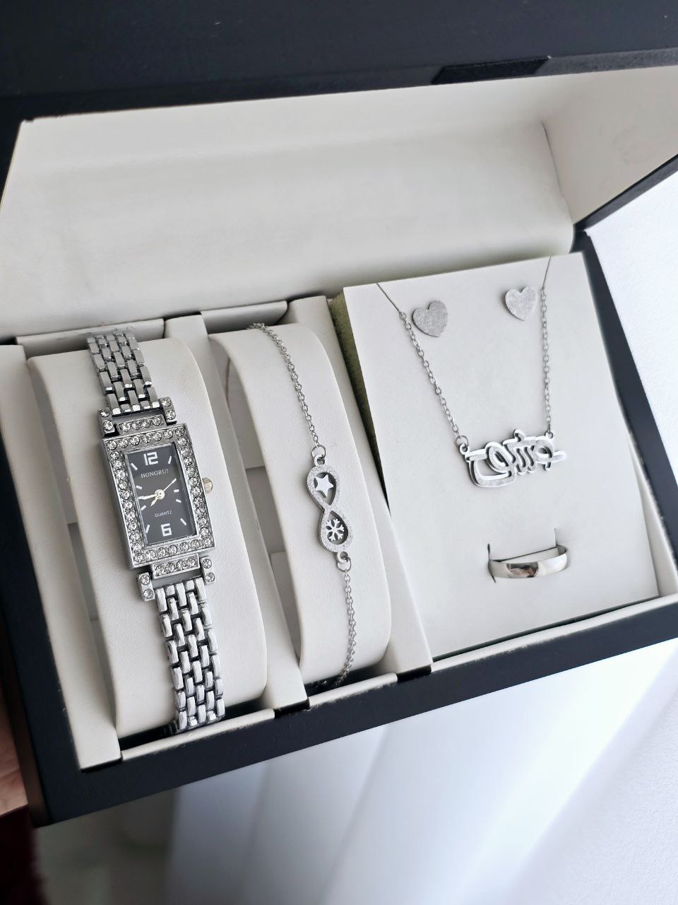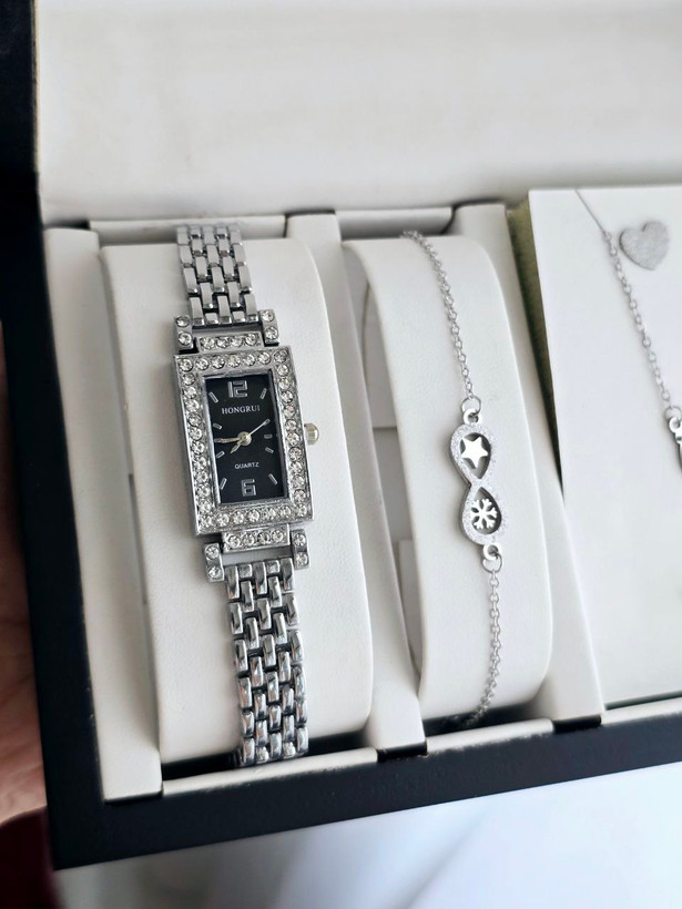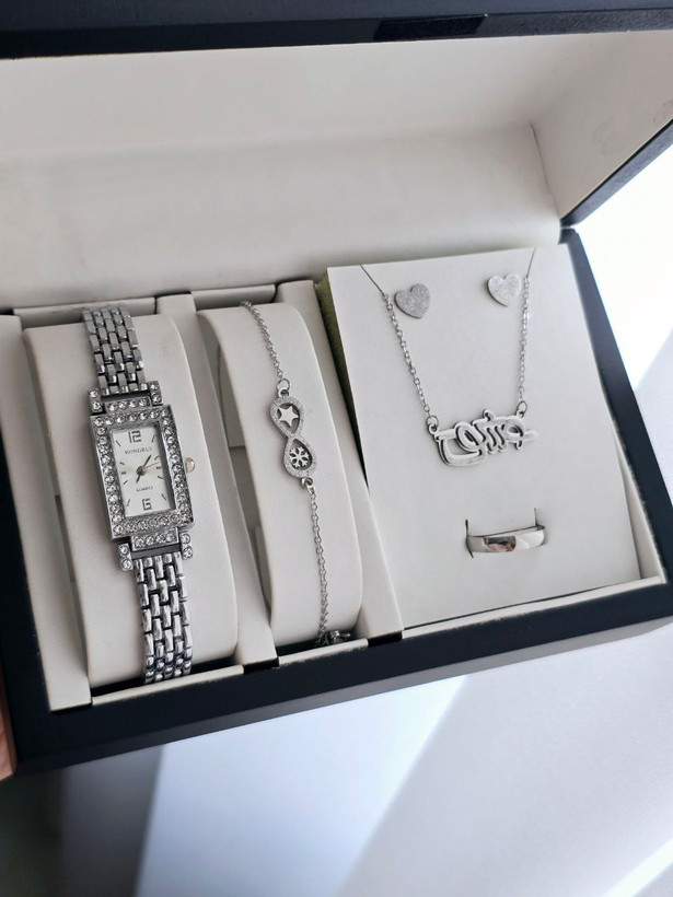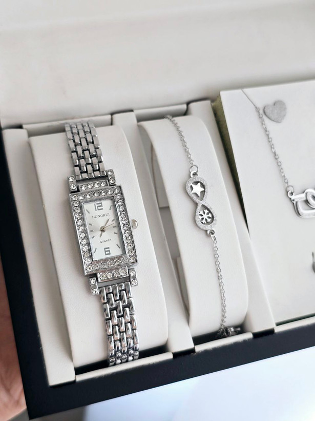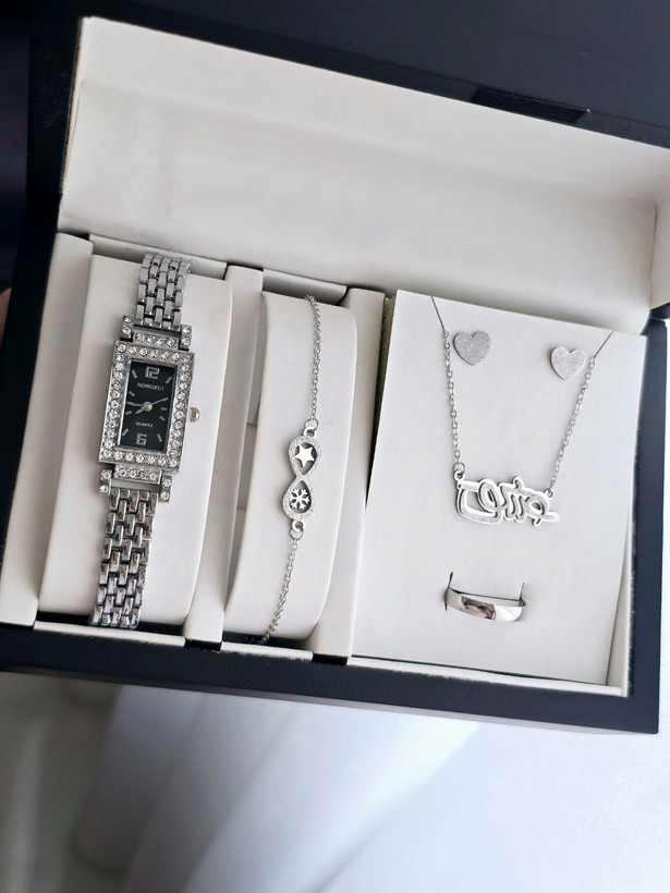 ست ساعت و دستبند و نیم ست استیل و رینگ (سایز 6 تا 10) ساعت نگینی مجلسی بهمراه جعبه کادویی و باتری یدکی