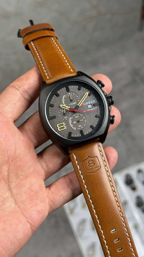 ساعت مردانه سه موتوره فعال برند کارن قطر ۴۵ میلی متر رنگ ثابت ضدآب قاب استیل بند چرم شیشه ضدخش روز شمار دارد ضدآب 3ATM باکس اصلی
