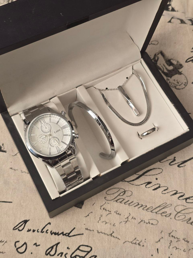 مشخصات محصولست مردانه ساعت و بنگل و گردنبند و حلقه بهمراه جعبه کادویی و باتری یدکی