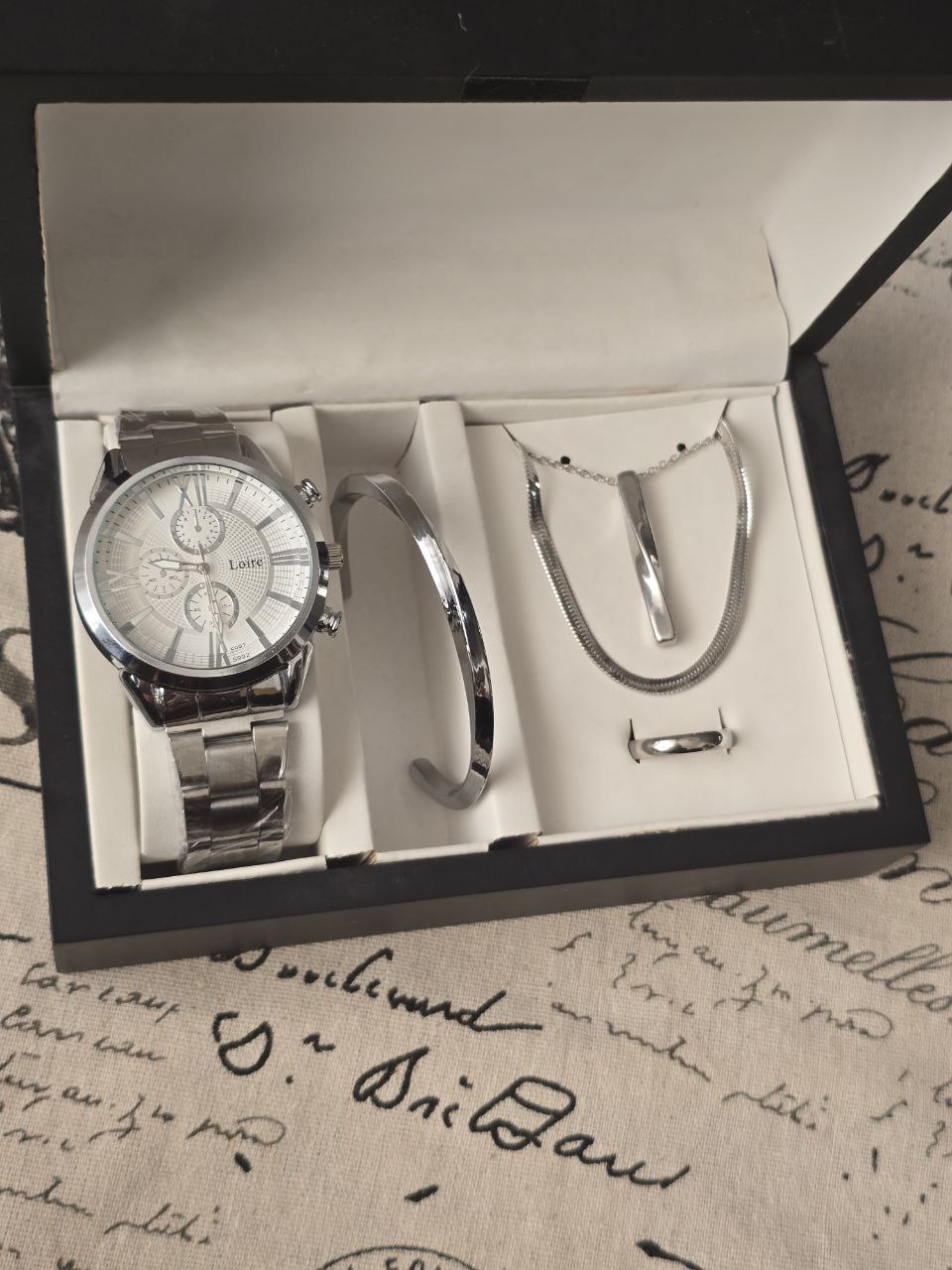 مشخصات محصولست مردانه ساعت و بنگل و گردنبند و حلقه بهمراه جعبه کادویی و باتری یدکی