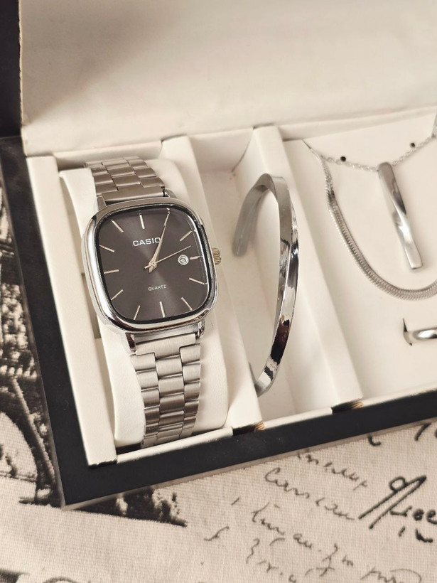 ست مردانه ساعت کاسیو مردانه تقویم فعال و بنگل و گردنبند و حلقه بهمراه جعبه کادویی و باتری یدکی