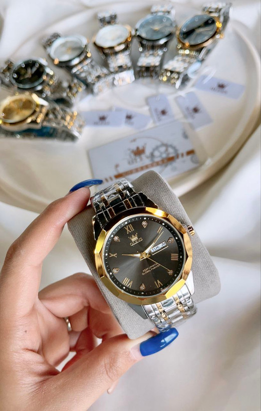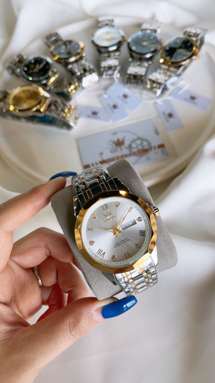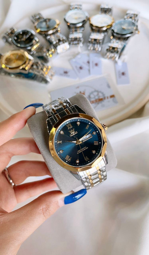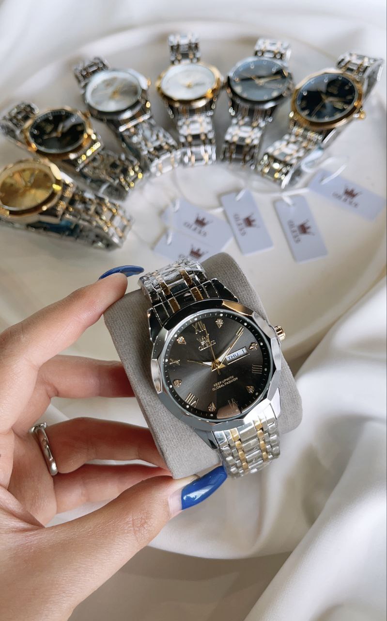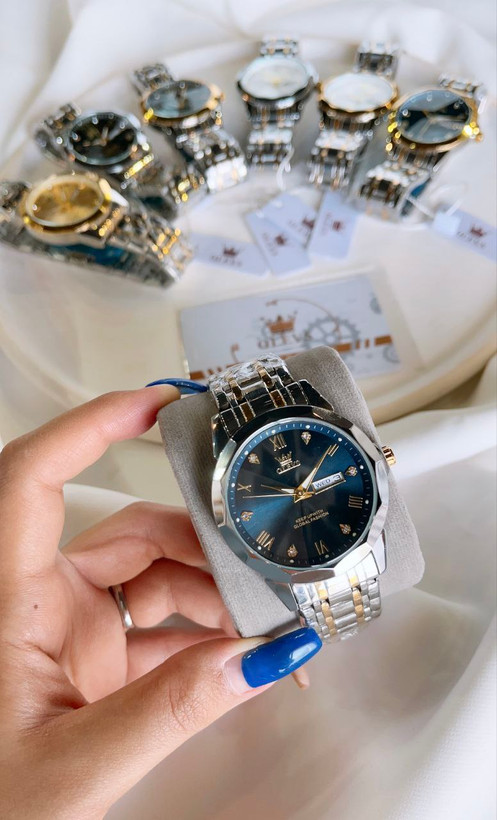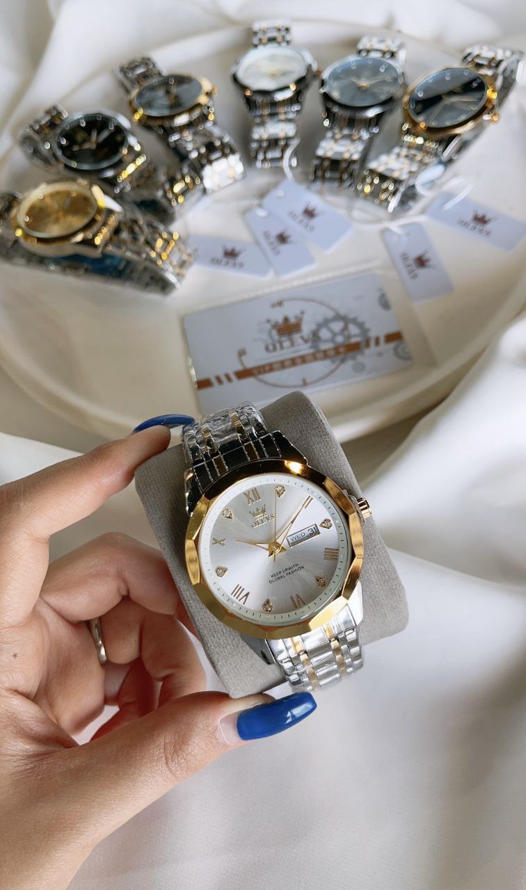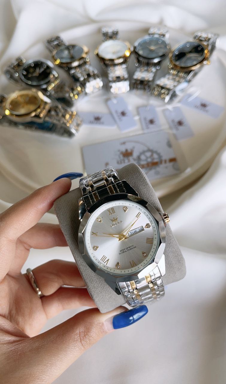ساعت olevs الوز مردانه موتور کوارتز مقاوم در برابر آب طرح الماس دارای روز شمار ایام هفته صفحه شب نما بند فولاد استیل قفل پروانه ای استیل مخفی شیشه سافایر ضدخش