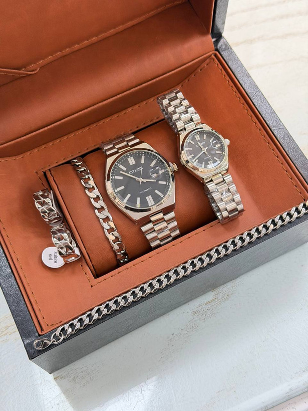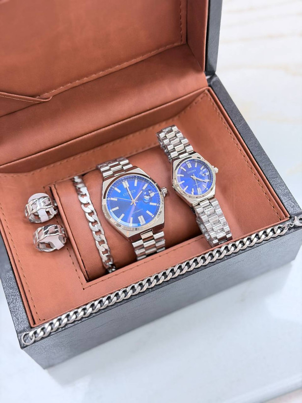 ساعت سیتیزن ست طرح اکودرایو تقویم دار تقویم ذره بینی قفل فشاری ضامن دار همراه دستبند و حلقه ست