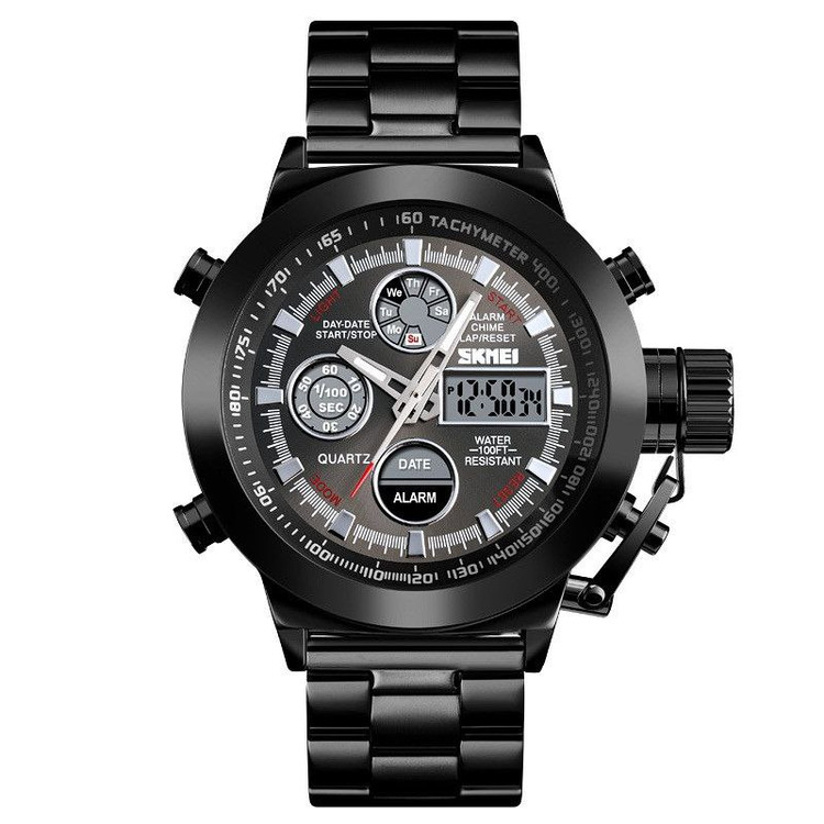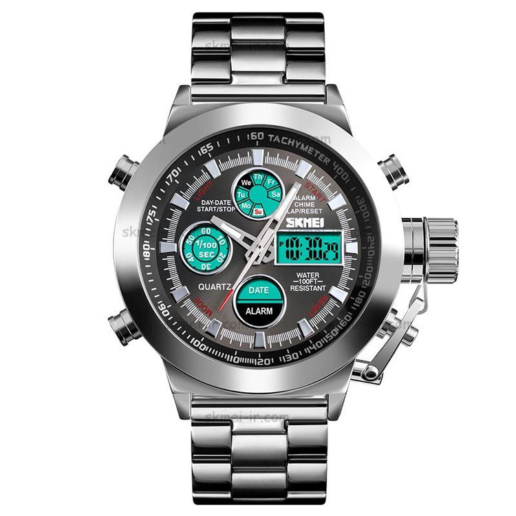 ساعت مردانه Skmei دو زمانه اورجینال رنگ ثابت ضدآب تقویم هفته و روز شمار آلارم بک لایت کرنومتر قطر 46 میلی متر شیشه ضدخش