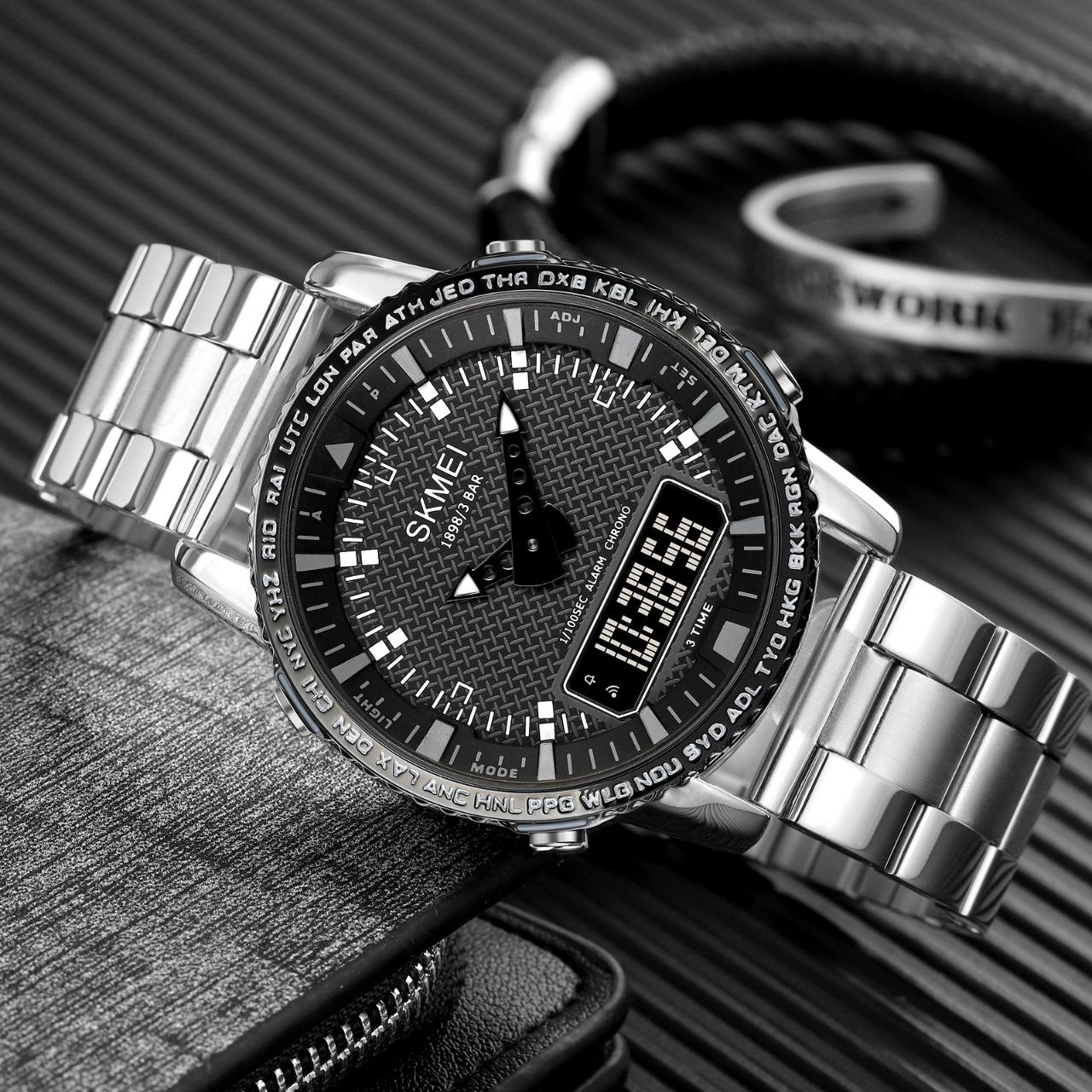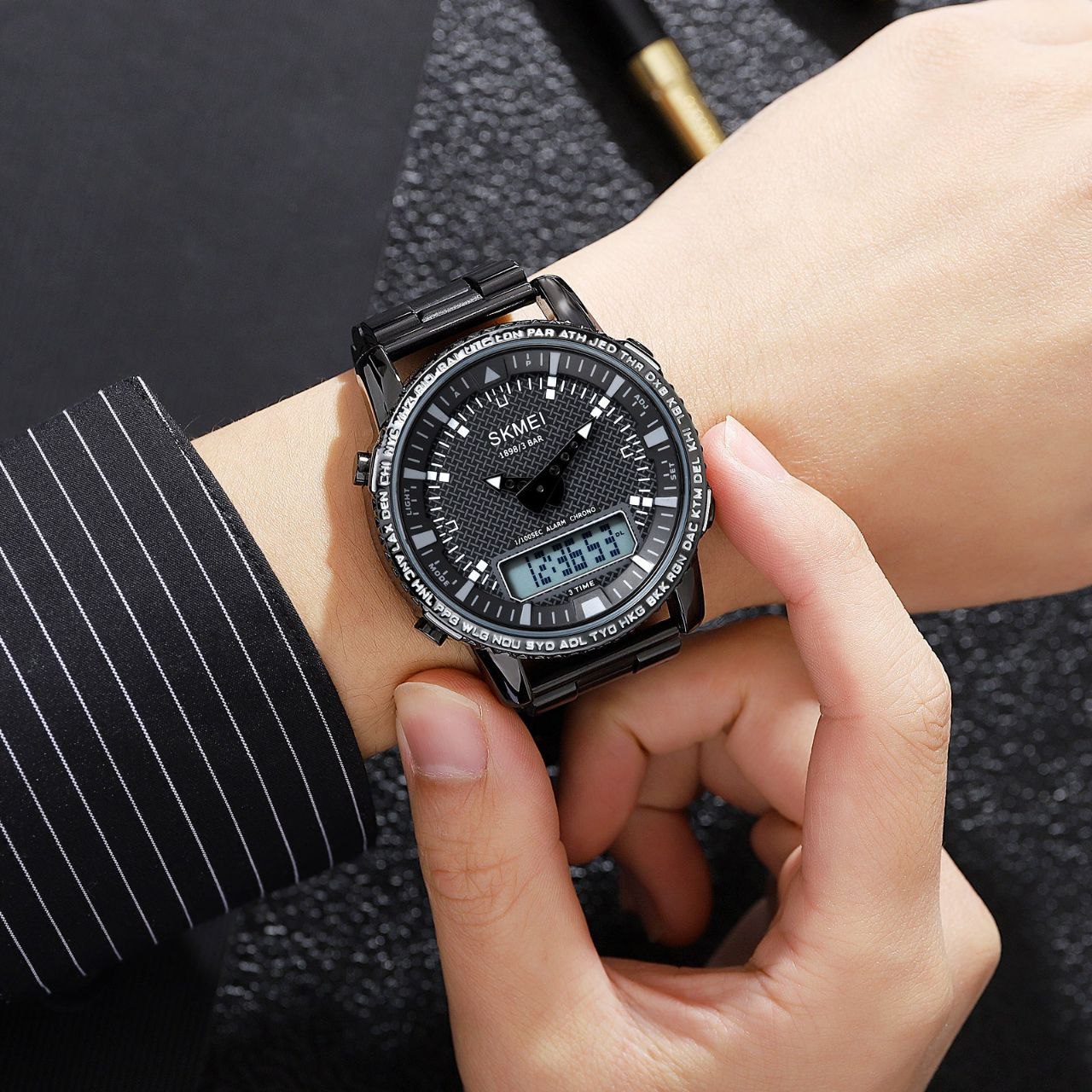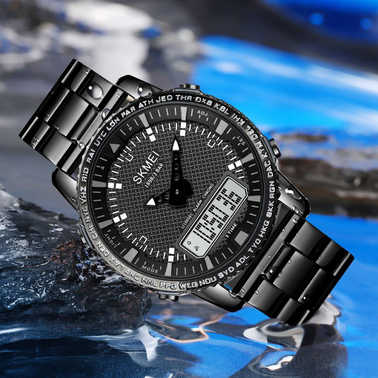 مشخصات محصولSkmei دو زمانه اورجینال رنگ ثابت ضدآب تقویم هفته و روز شمار آلارم بک لایت کرنومتر قطر ۴۴ میلی متر شیشه ضدخش