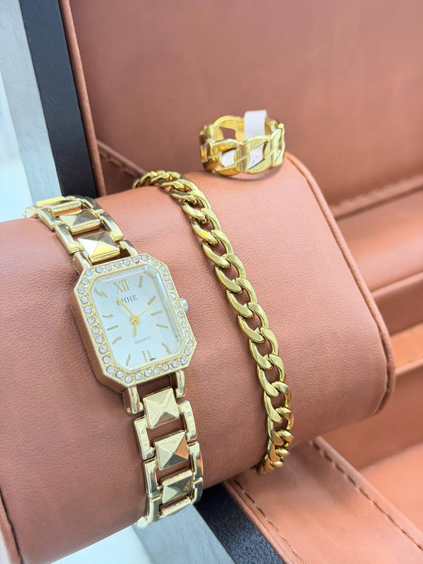 ست ساعت ودستبند و حلقه زنانه طلایی رنگ