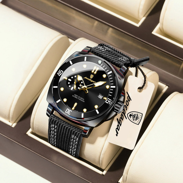 مشخصات محصولpoedagar مردانه رنگ ثابت ضدآب قطر 44 میلی متر بند رویه برزنت داخل چرم روز شمار کیس استیل باکس مارکدار