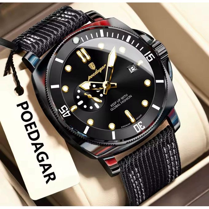 مشخصات محصولpoedagar مردانه رنگ ثابت ضدآب قطر 44 میلی متر بند رویه برزنت داخل چرم روز شمار کیس استیل باکس مارکدار