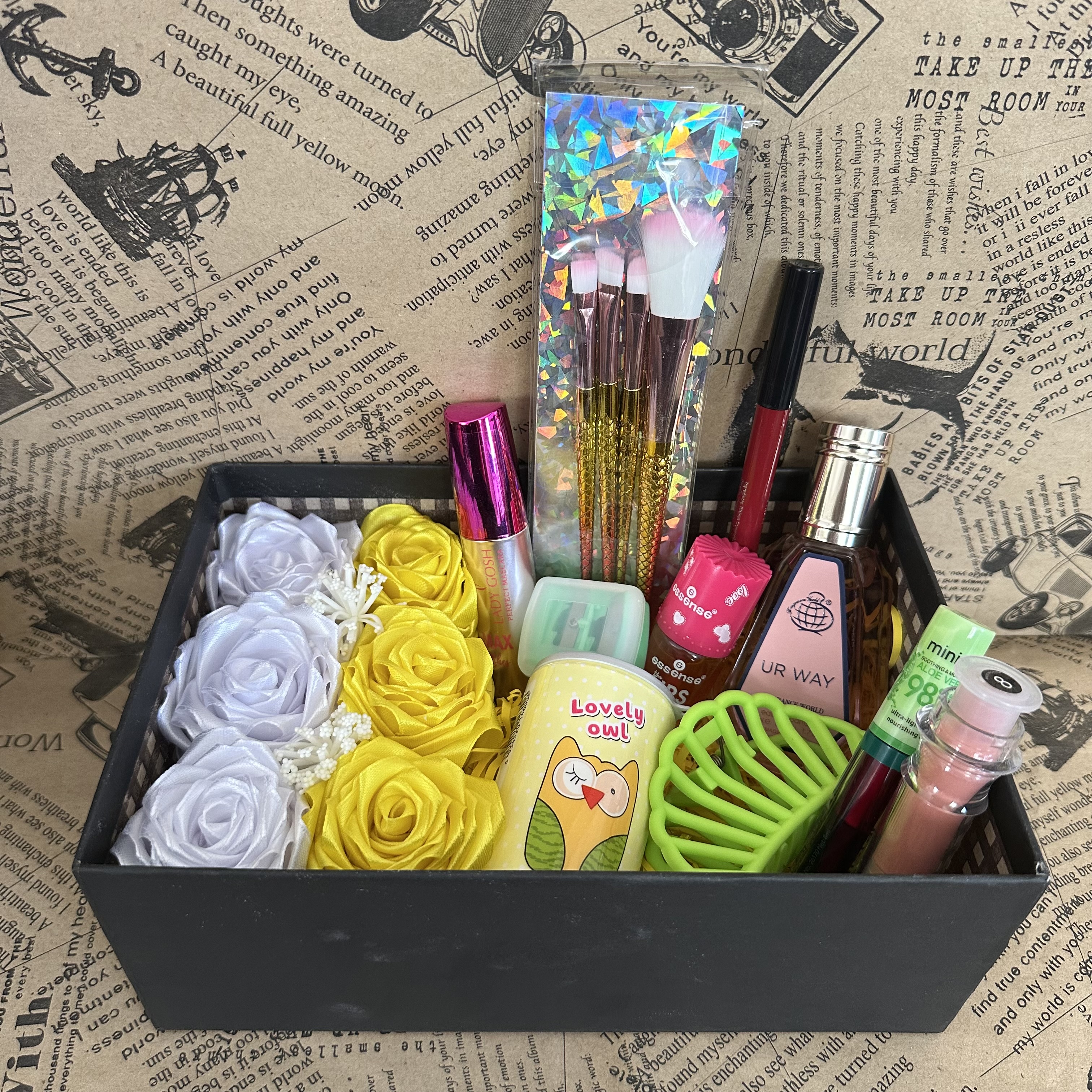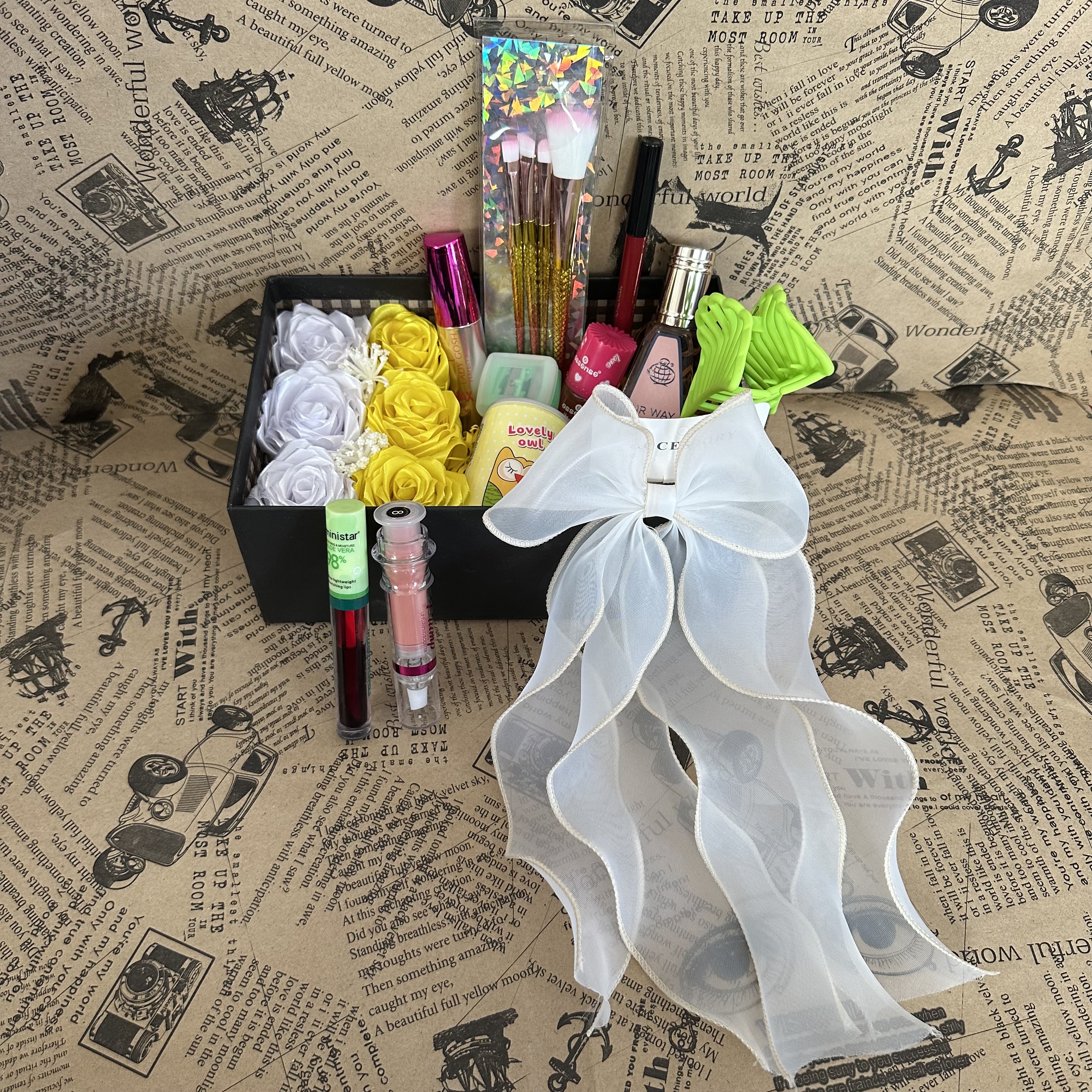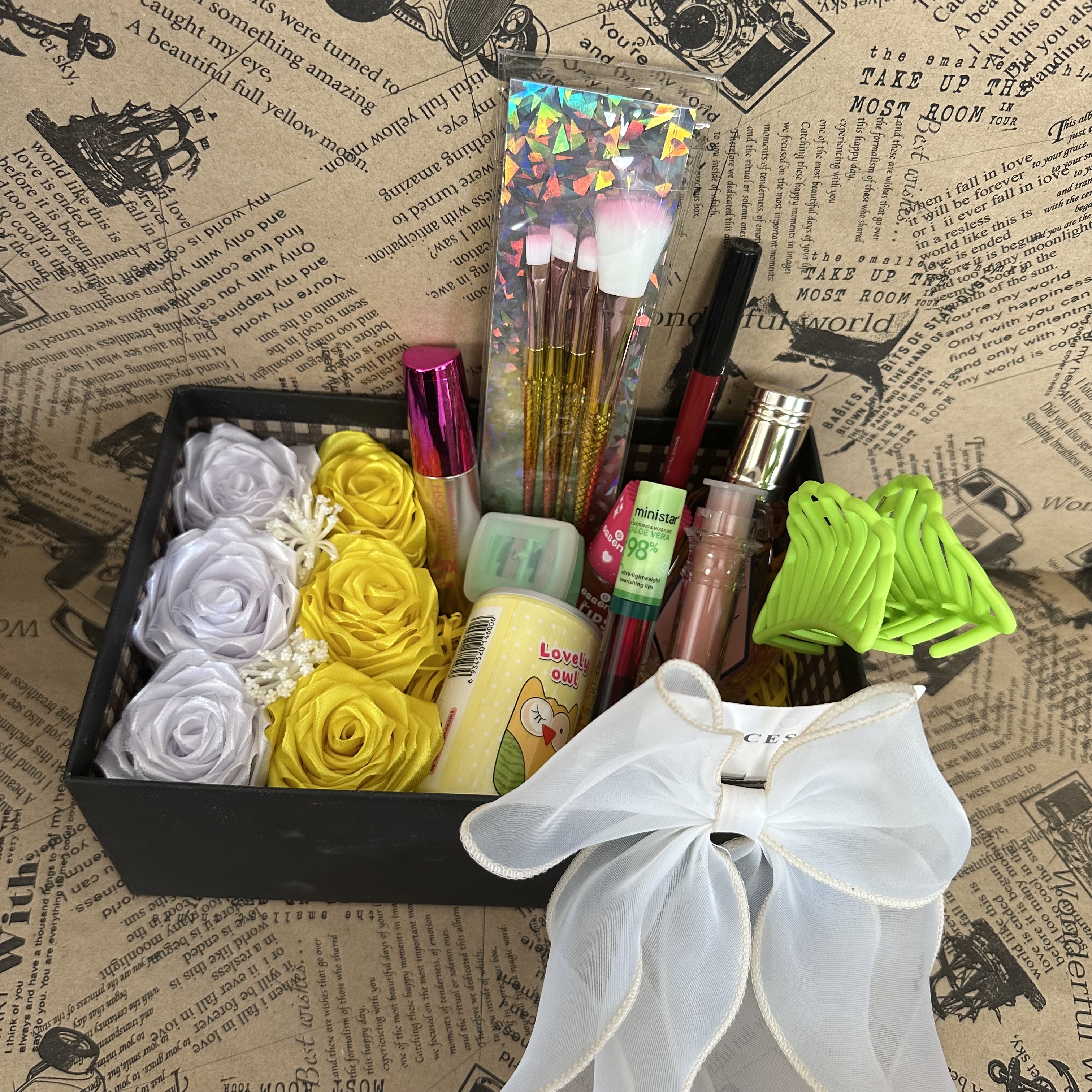 اقلام باکس: ادکلن-کلیپس-براش سه عددی-رژمدادی-تراش دوقلو-دستمال مرطوب قوطی-تینت لب-تینت آلوئه ورا-حجم لب آمپولی-۶عدد گل ربانی-براش سه عددی