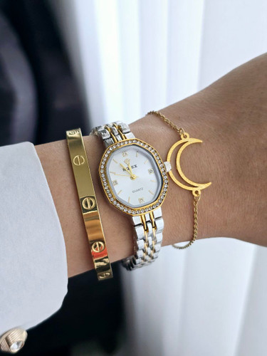 ساعت زنانه برند رولکس بند استیل به همراه النگو کارتیر و دستبند طلایی استیل