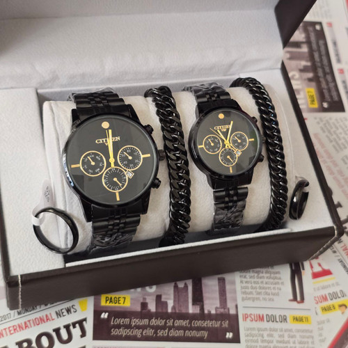 ست ساعت زنانه و مردانه برند سیتیزن بند استیل ساعت ها دارای روزشمار دو عدد دستبند کارتیر استیل و دو تا انگشتر کارتیر به همراه دو عدد جعبه کادویی و باتری یدکی