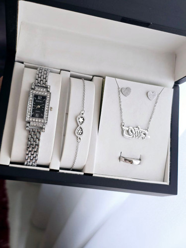ست ساعت و دستبند و نیم ست استیل و رینگ و ساعت نگینی مجلسی به همراه جعبه کادویی و باتری یدکی