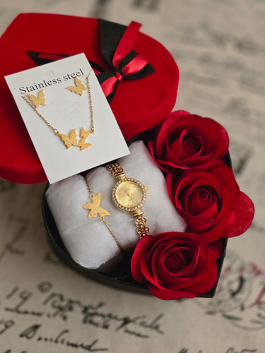 باکس هدیه زنانه و دخترانه ساعت و دستبند و نیمست استیل طلایی رنگ ثابت و باکس و گل