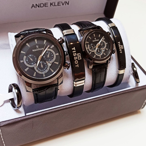 ست ساعت مردانه و زنانه مارک کالکشن طرح سه موتوره به همراه حلقه ست و دستبند چرمی ست پلاک دار بهترین گزینه برای کادو و هدیه به همراه جعبه کادویی