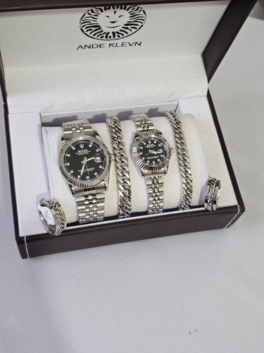 ست ساعت زنانه و مردانه رولکس و دو عدد دستبند کارتیر استیل و دو تا انگشتر کارتیر به همراه دو عدد جعبه کادویی و باتری یدکی