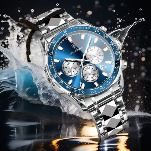 ساعت پوداگار الماسی مردانه دارای روز شمار ایام هفته صفحه شب نما برند شرکتی بند استیل قطر صفحه ۴۲ میل کریستال قاب یاقوت کبود ضدآب تا عمق بالا شیشه معدنی رنگ ثابت قفل سگک دوپروانه ای موتور کوارتز