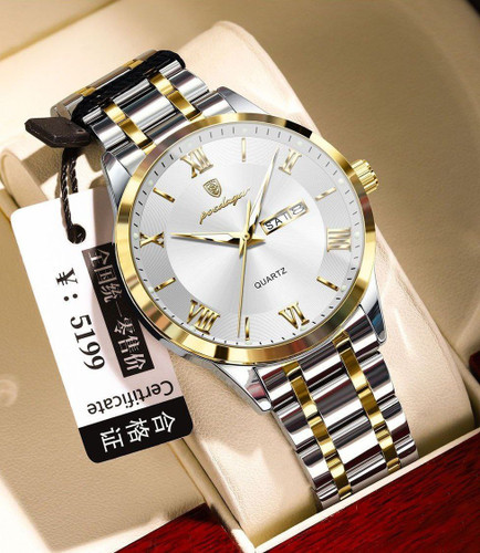 ساعت مردانه بین باند مقاوم دربرابر آب برندشرکتی شناسه دار دارای روز شمار بند استیل شیشه سافایر شب نما تقویم نمایشی قفل کلیپسی موتور کوارتز
