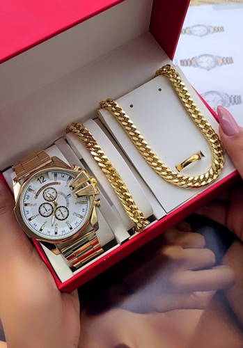 ست مردانه ساعت و بنگل و گردنبند و حلقه بهمراه جعبه کادویی و باتری یدکی