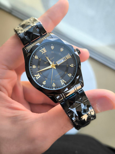 ساعت مردانه الوز موتور کوارتز مقاوم در برابر آب طرح الماسی دارای روز شمار ایام هفته صفحه شب نما بند وستاری قفل دو پروانه شیشه سافایر ضدخ